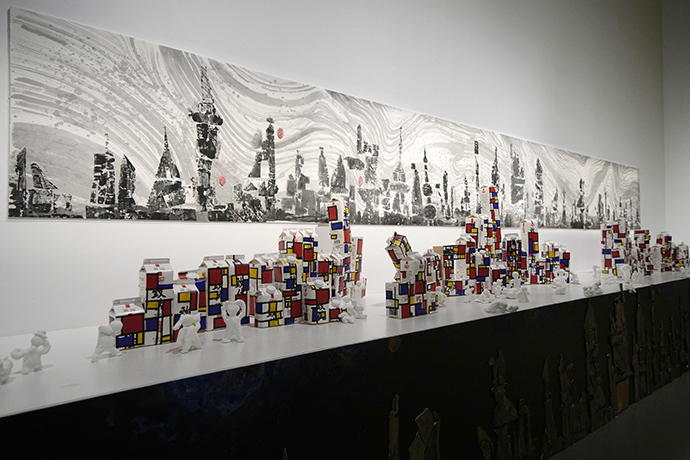 用牛奶盒做成的蒙德里安风格的城市高楼群