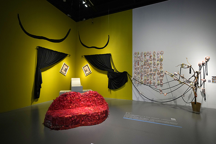 超现实主义绘画大师达利的红唇沙发是他颇具代表性的作品。孩子们用颇具童心的方式演绎了达利的这件作品。红唇沙发由幼儿园最小班的孩子们用家里带来的红布头和红色的绳子黏贴而成,仔细看这件红沙发,上面有红色的毛线,有礼盒上剪下的红色缎带,几条缎带上还有“红宝石”“凯司令”蛋糕店的名字,表现的是童趣,亦或是环保主义或是消费主义?退后几步,又会发现布展时,大家巧妙地用窗帘、画框等结合,在房间里组成了一张达利的脸。