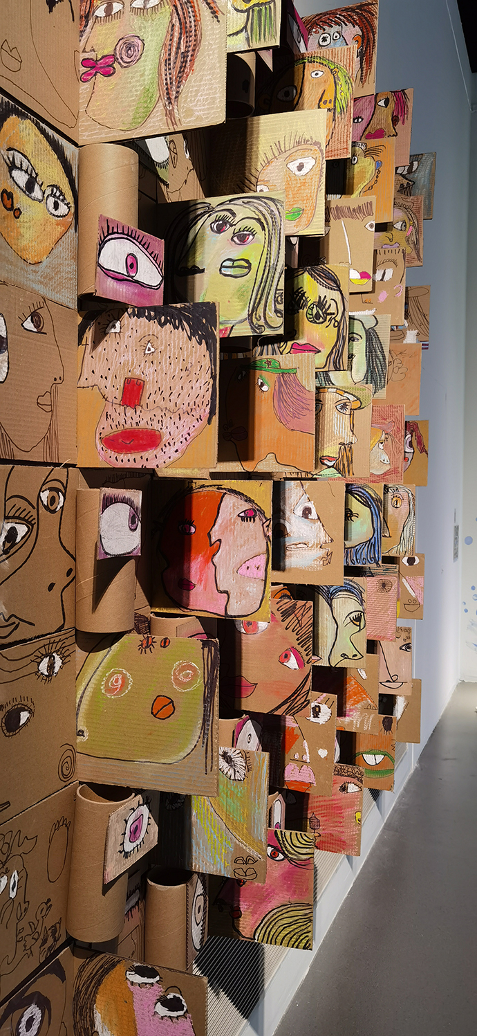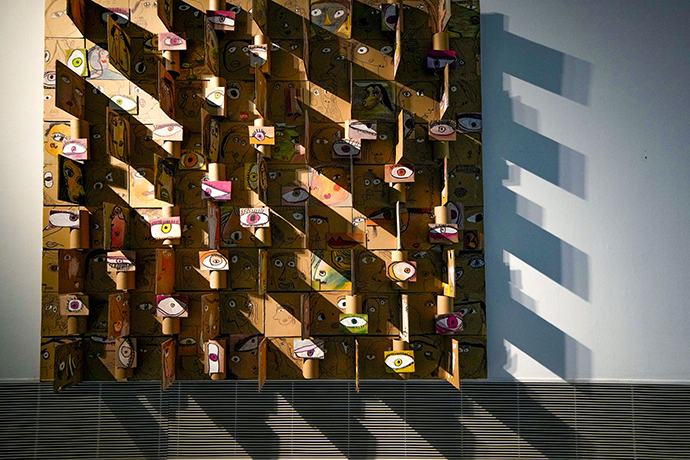 老师们把这些脸和眼睛拼在一起,组成了《千人千面》。为了让孩子直观地理解“立体主义”,有些纸板被平贴在墙上,有些则竖了起来,一只只眼睛浮现在上面。这样,不论从哪个角度,都能看到许多张脸。