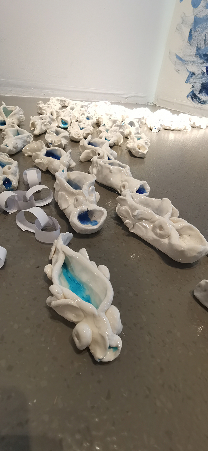 走近仔细看看,才发现其中的“玄机”。一进门看到的第一件作品《鱼跃鸢飞》远远望去,是一幅立体的《神奈川冲浪里》,走近看去,深蓝色的海水,是卷筒纸芯用颜料刷成深蓝色,拼接而成,这是宋幼小班小朋友的功劳。散落在地面上和浪头高处细碎的白色浪花,是白色的长条纸穿成圆环贴上去的,这是出自中班小朋友之手。浪花之上,最壮丽的主体部分是一只月出水面的白色大鱼,大鱼是由一只只白色的小瓷鱼组而成。每只瓷鱼都像一只白白的饺子,张着鳞片,背上的开口里含着一汪碧蓝。每条小鱼都是不同的,有胖有瘦,有大有小,有的精致有的拙朴,从墙面一直游到地面。