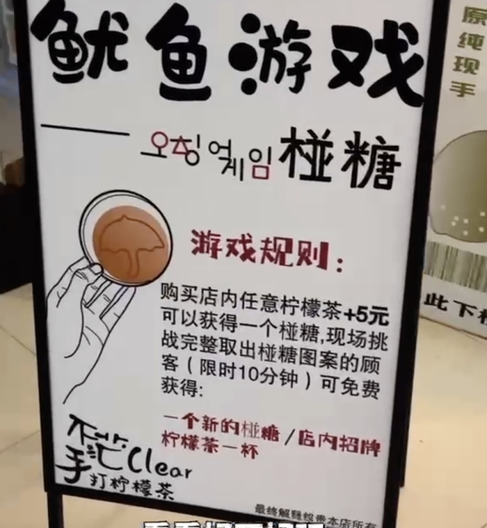 “现场挑战完整取出椪糖图案的顾客(限时10分钟),可免费获得新椪糖或者招牌柠檬茶。”一如剧情,这家饮品店试图制造紧张感。