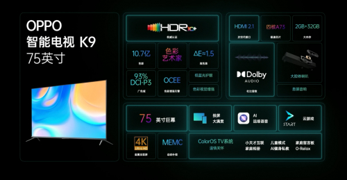 OPPO智能电视K9的屏幕支持10.7亿色彩、93%P3广色域、低蓝光护眼、MEMC动态补偿,并且通过了HDR10+认证、ΔE≈1.5高色准等等。通过上述配置不难发现,OPPO智能电视K9 75英寸在色彩方面带来十足的诚意。