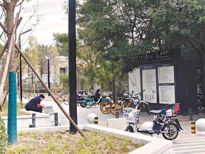 记者发现,地铁出口西侧就有一个自行车棚,但许多人为了方便并未将自行车停进去,有的就挡在车棚门口。如果在规划建设公园的同时,就把共享单车的停车线划好,自行车停车指示牌装好,大家也就能自觉规范停车,不会像现在这么乱了。