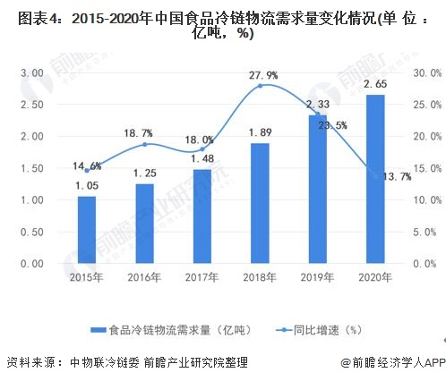 食品冷链物流作为物流行业的细分领域之一,近几年随着国民经济和居民生活消费水平的快速提升,带动了食品冷链物流需求的快速增长。2020年我国食品冷链物流需求总量为2.65亿吨,同比增长13.7%。