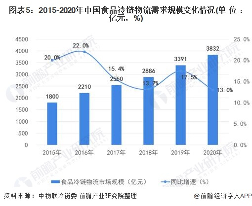 2015-2020年我国食品冷链物流需求规模增速保持在10%以上,2020年我国食品冷链物流市场总规模为3832亿元,比2019年增长440.8亿元,同比增长13.0%,仍保持较高的增长态势。预计2021年中国食品冷链物流需求市场规模将突破4000亿元。