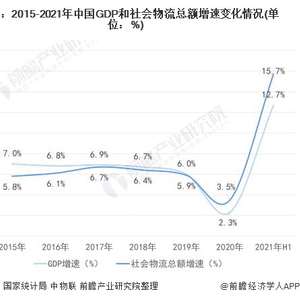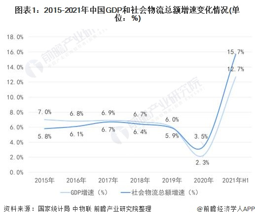 2015-2019年,国内社会物流总额增速逐渐趋近于GDP增速,到2020年社会物流总额增速反超GDP增速。2021年上半年,社会物流总额增速达到15.7%,超过GDP增速3个百分点。一方面,国民经济快速恢复增长带动物流市场需求的增长;另外一方面,物流行业也逐渐成长为经济增长的新动能。