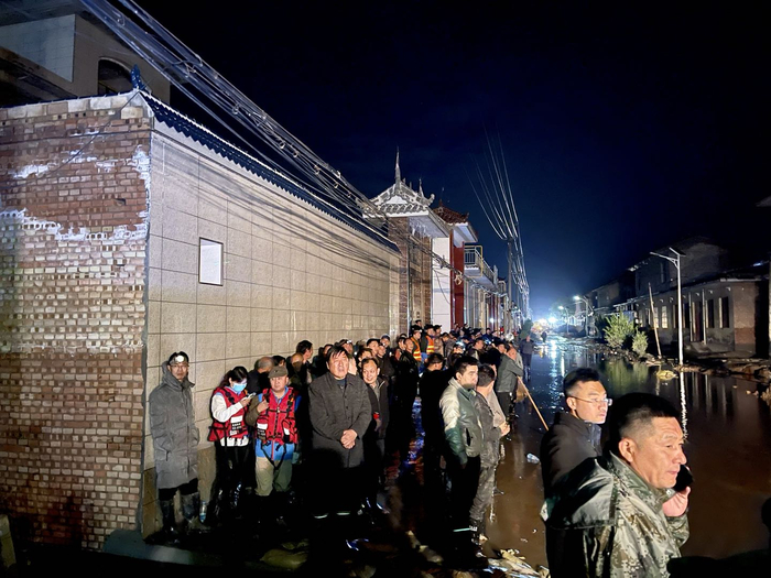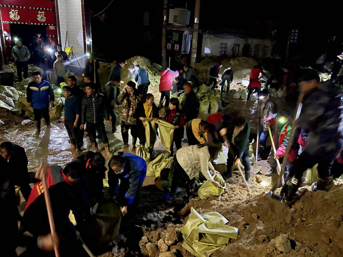 装袋现场忙而不乱,有人指挥,有人分发雨鞋、头灯,有人分发食物和水。干累了,还有人分发香烟。