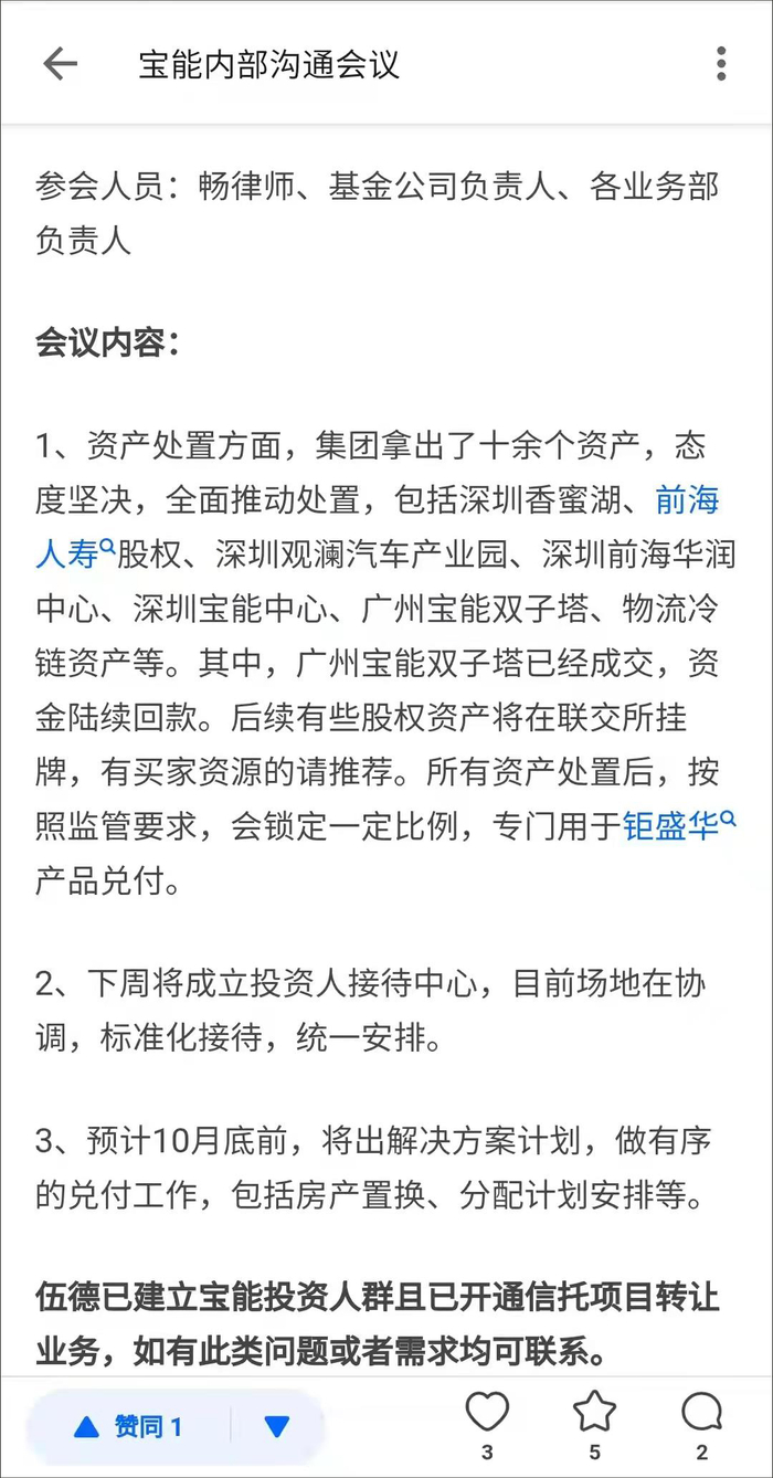 在这个“内部会议”上,宝能拟处置资产包含10余个优质项目,包括前海人寿股权、深圳香蜜湖、深圳观澜汽车产业园、深圳前海华润中心、广州宝能双子塔、物流冷链资产等。
