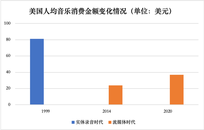 不过,好在数字音乐这块蛋糕盘足够大,留给音乐平台们的课题是如何开发潜在的市场。丁楠认为:“音乐市场的人均消费还是比较低的,所以我们在版权价值开发上有很多空间。”以音乐产业发达的美国为例,其在流媒体时代的2014年和2020年,人均音乐消费金额分别是24美元和37美元。这个数字看起来并不低,但是美国人均音乐消费金额在实体音乐黄金时代的1999年达到过81美元。