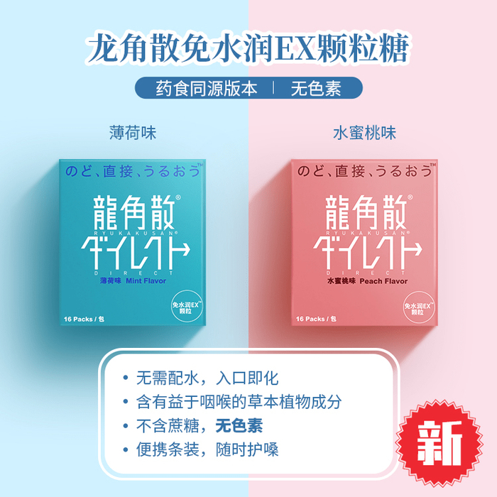 龙角散免水润颗粒系列在一众专业歌手、演员及头部主播的安利下,成为了近年来火遍全网的“护嗓神器”。该系列有水蜜桃味和薄荷味2种口味,均是无需配水直接服用的速溶颗粒,入口即化。该系列产品在龙角散经典铝罐粉末的核心配方之外,额外添加了人参和儿茶钩藤两味草本,温和的草本成分可直接作用于咽喉,激活咽喉的纤毛运动,从而促进排痰、抑制咳嗽,帮助主播快速恢复咽喉活力。
