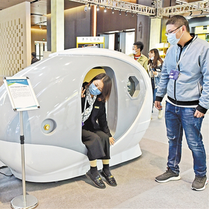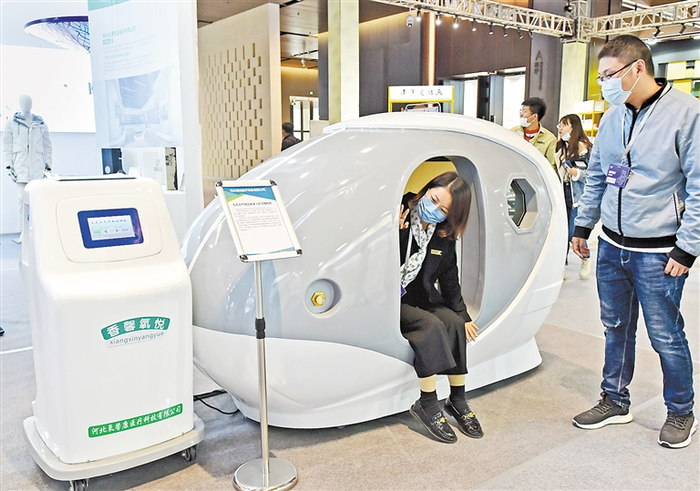 10月17日,在第四届河北国际工业设计周河北工业设计成果展衡水展区,一位参观者在体验生态大气微压氧单人卧式睡眠舱。 河北日报记者 赵海江摄