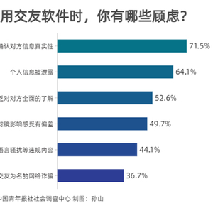 在使用交友软件时,受访者的顾虑还有:缺乏对对方全面的了解(52.6%),受网络滤镜影响感受有偏差(49.7%),存在涉黄、语言骚扰等违规内容(44.1%),以交友为名的网络诈骗(36.7%),用户匹配机制有缺陷(27.5%)等。