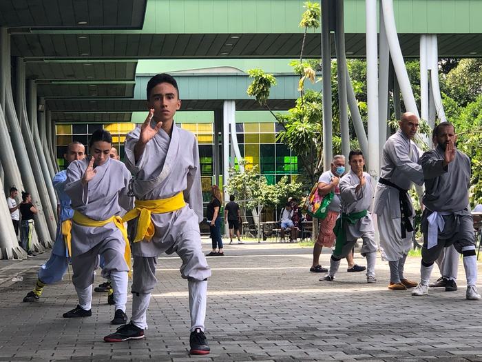 在麦德林体育场,练习少林功夫的本地人