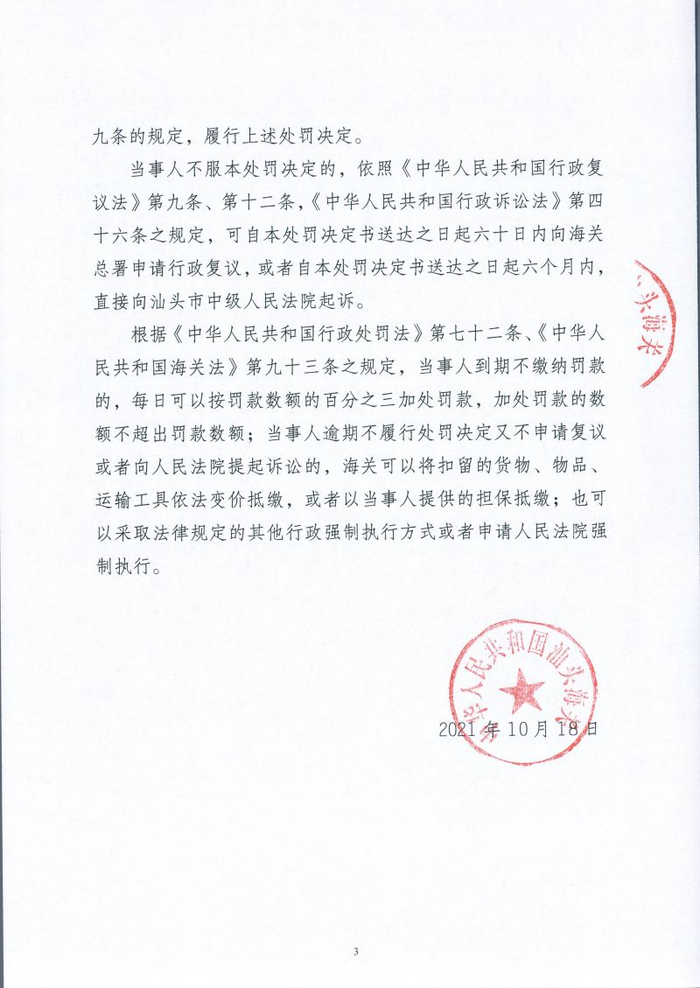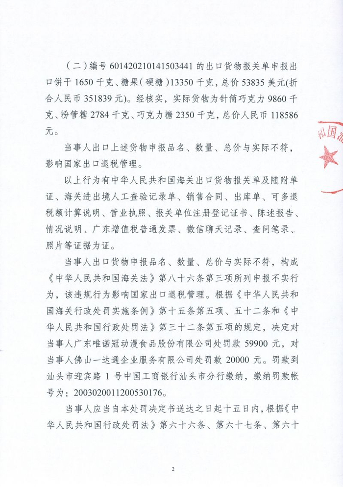 原标题:汕头海关发布对广东唯诺冠动漫食品股份有限公司行政处罚决定书