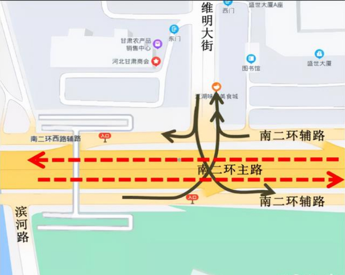将西二环地面主路(红旗大街-中华大街)抬升为高架桥,维明大街在南二环主路高架桥下与南二环地面辅路相交设置信号灯交叉口,实现与二环的连通;同时拓宽滨河街至汇明路,维明大街南延与滨河街贯通。