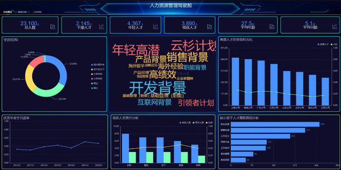 领导决策支持平台:基于经验的决策到数据驱动的决策,实现决策高效和科学。通过数据中台可快速搭建HR管理驾驶舱,支持高层决策。借助数据中台的强大数据集成能力,整合HR、财务和生产经营数据,解决人效分析实现难的问题,丰富、健全了人力资源管理驾驶舱的分析指标体系。