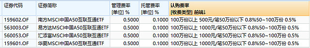 从费用来看,此次发行的4只基金管理费率均为0.5%,托管费率均为0.1%。认购费率也基本接近,仅对于100万份以上的投资者略有差异。南方MSCI中国A50互联互通ETF对100万份以上,按500元收取每笔费用,其余3只按1000元收取每笔收取费用。