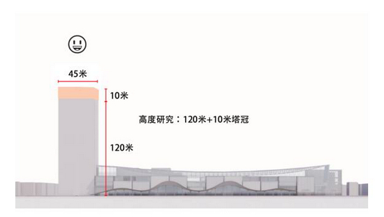 为了更能凸显“扬帆”的视觉效果,项目采用“120米塔楼+10米塔冠”的设计思路。通过优化建筑群长宽比例,使塔楼更具流线型,形成挺拔的建筑群。