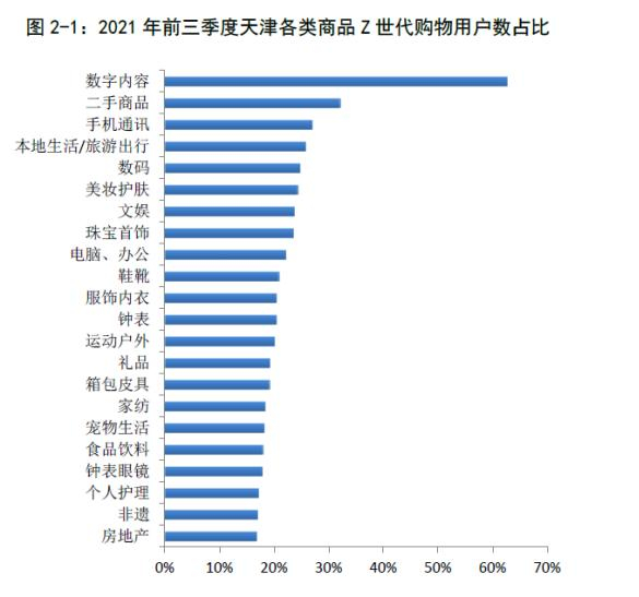 Z世代(95后)正成为最具活力、喜欢尝鲜、个性鲜明、兴趣多元的新生代消费群体,引领消费发展新趋势,相关消费潜力不断释放。京东数据显示,2021年前三季度,天津Z世代消费群体占比为16.4%,其中,天津数字内容、手机通讯、数码类商品中Z世代购物用户数占比达62.6%、26.9%和24.7%,明显高于全品类Z世代用户占比。