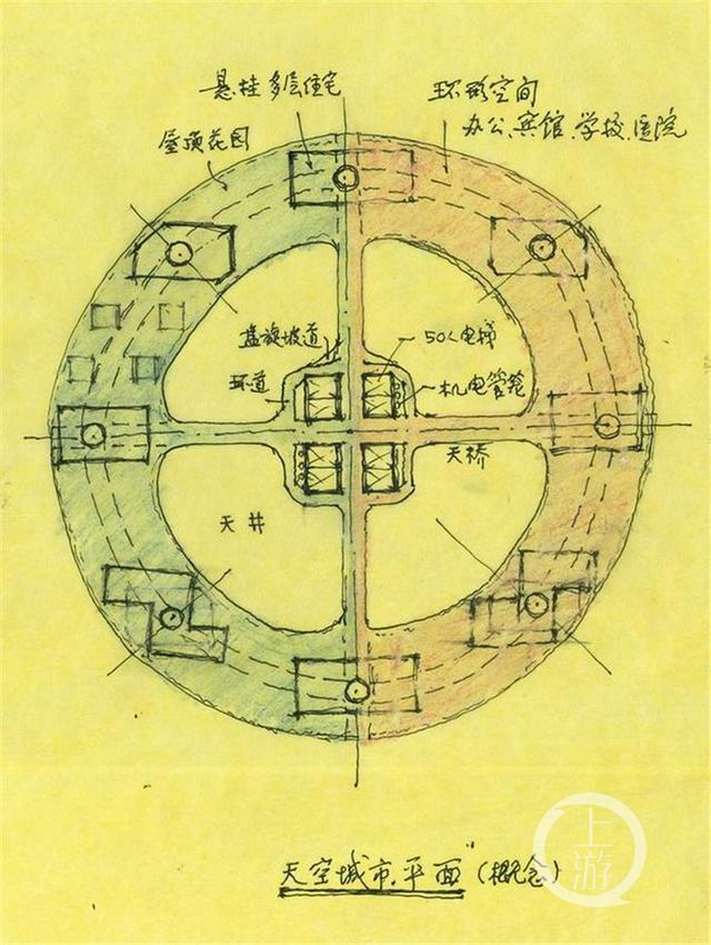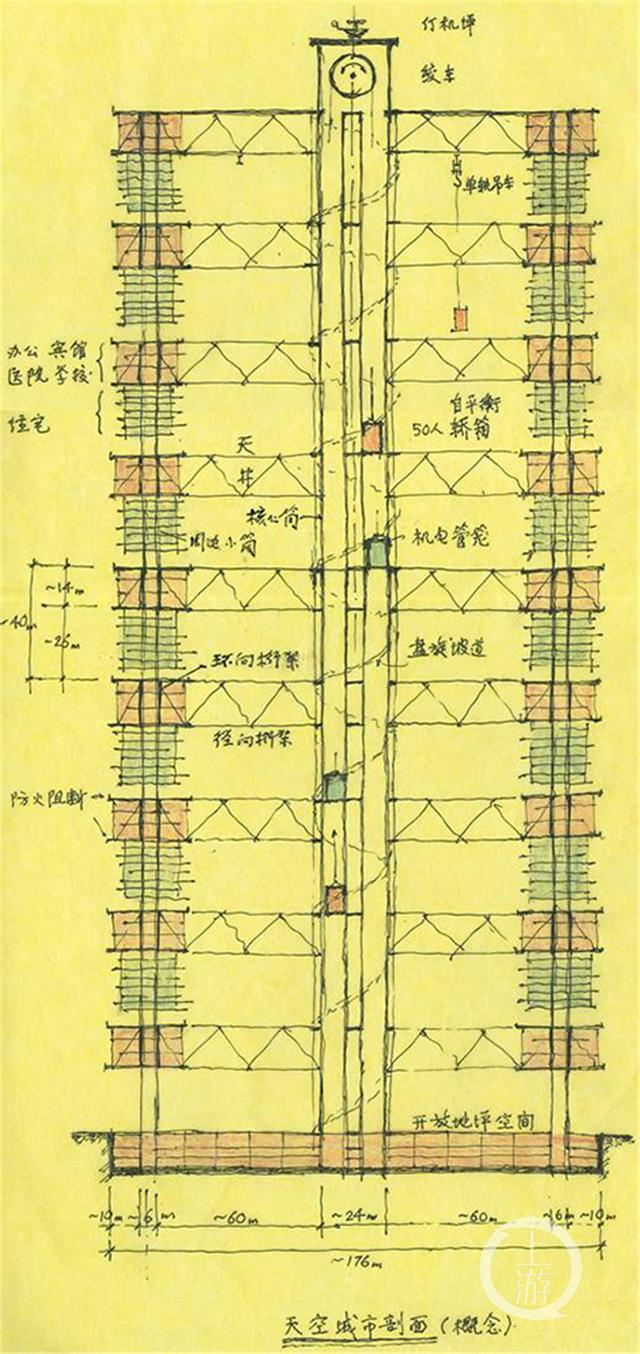 对此,江欢成院士构想出自己的天空之城,综合考虑居住环境的优美、造价的低廉、功能的合理性,“竖起街道、向天借地”。