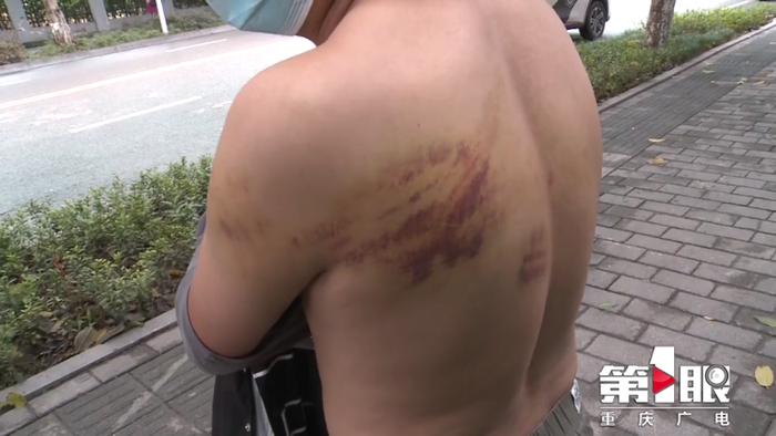 小勇后背是一团团淤青,左眼、脖子,还有大腿上,也能看到明显的伤痕。10月9号,小勇去高新区曾家找工作。一家从事职业中介的人员秦某,开车带他去了璧山一家工厂。到那里之后,小勇被告知需要交体检费,他当场表示了拒绝,对方立马变了脸。从璧山回曾家的路上,小勇遭到了殴打、罚跪和灌酒。