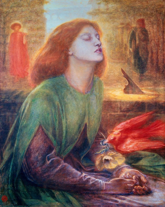 罗塞蒂,《贝娅塔·贝娅特丽克丝》,1863年,画中模特为西达尔,作品集中体现了罗塞蒂 对描绘美丽女性的热衷。