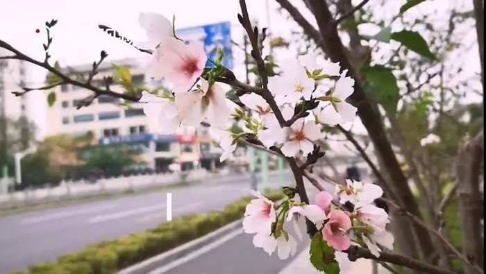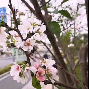 不过,也有一些被气温忽悠到反季开花的植物抢了桂花的风头,比如闵行区七莘路近三八路附近,一排樱花树中5棵不同程度的开花了,其中两棵的花朵竟然开满枝头,白色的、粉色的樱花,伴着微风摇动丝丝灵动,别有一番风景。