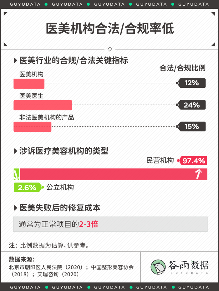 根据中国整形美容协会、艾瑞咨询等机构的测算,医美机构合法/合规率依然处于相当低的阶段。