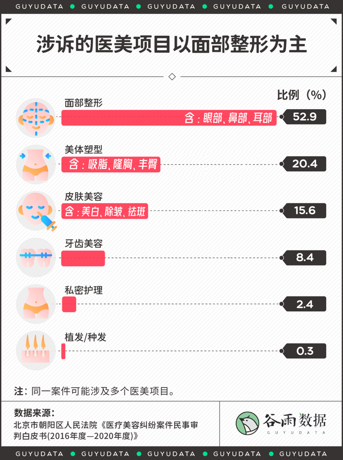 在北京市朝阳区人民法院整理的《医疗美容纠纷案件民事审判白皮书(2016年度—2020年度)》里,面部整形是纠纷出现的重灾区,包括眼部、鼻部与耳部。超过一半的案件与面部整形有关。