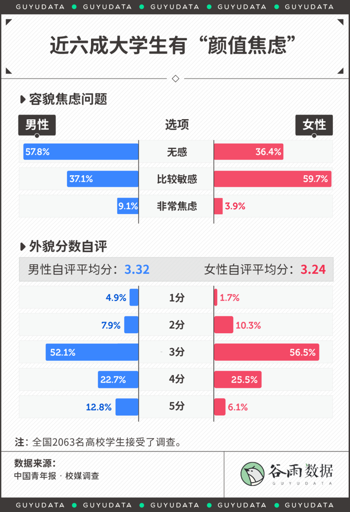 中国青年报的调查发现,近六成大学生表示自己有“颜值焦虑”。