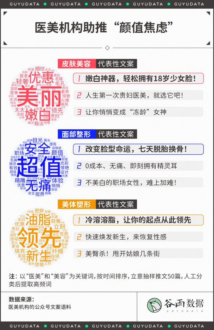 除了用平均数让你觉得医美触手可得,医美机构殚精竭虑的文案无疑也是焦虑的助推器。
