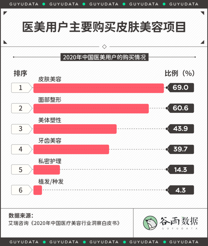 根据艾瑞咨询的调研,中国医美用户主要购买皮肤美容项目,其次是面部整形与美体塑形。