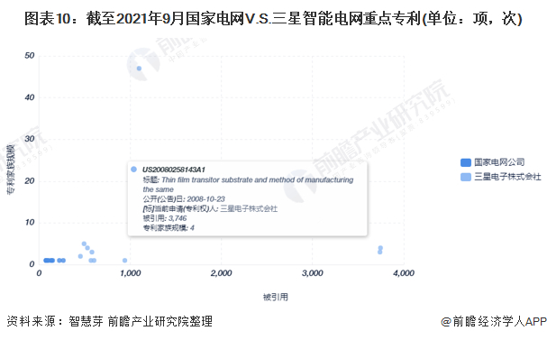 在重点专利布局上,两家公司所拥有的智能电网相关专利中,被引用次数最多的专利是三星电子株式会社的“Thin film transitor substrate and method of manufacturing the same”(专利号US20080258143A1)专利,一共被引用了3746次。