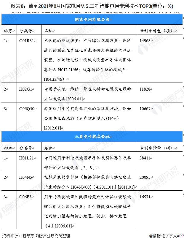 目前,对于国家电网来说,G01R31:电性能的测试装置;电故障的探测装置;以所进行的测试在其他位置未提供为特征的电测试装置;在制造过程中测试或测量半导体或固体器件入H01L21/66;线路传输系统的测试入H04B3/46)是国家电网第一大智能电网技术细分分布领域;而三星则重点布局于G01L21:专门适用于制造或处理半导体或固体器件或其部件的方法或设备〔2,8〕。