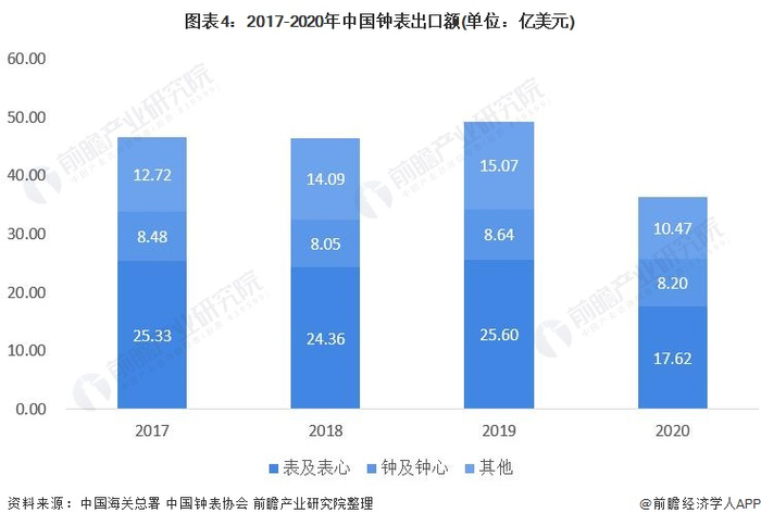 根据海关数据统计,近年来我国钟表行业出口额呈现平稳发展的趋势,进口额逐年增长。2020年,受疫情影响,钟表行业出口总额为35.30亿美元,同比下降28.4%;进口额受高端钟表需求的增长,进口总额达到44.69亿美元,同比增长8.63%。