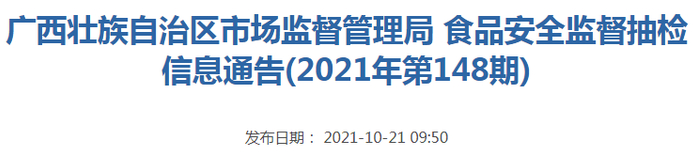 中国质量新闻网讯 2021年10月21日,广西壮族自治区市场监督管理局网站发布食品安全监督抽检信息通告(2021年第148期)。据通告,近期广西壮族自治区市场监督管理局组织抽检粮食加工品、饮料、食糖、水产制品、淀粉及淀粉制品、糕点、豆制品、餐饮食品和食用农产品等9大类食品719批次样品。根据食品安全国家标准、相关产品明示标准进行检验和判定,所检项目检出不合格样品15批次,检出微生物污染、重金属污染、农兽药残留超标、食品添加剂和质量指标不合格等问题。具体情况如下: