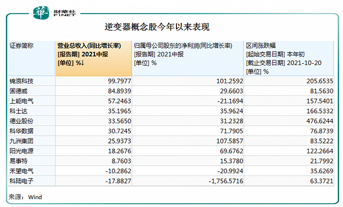 在光伏和储能双轮驱动下,光伏逆变器板块10月20日涨了2.43%。板块企业今年来斩获颇丰,截至10月 20日收盘,逆变器企业阳光电源、锦浪科技和固德威今年以来涨幅分别约为 122%、206%和82%。