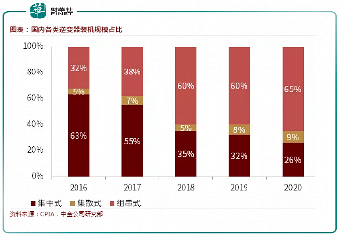 随着分布式光伏装机占比提升,对组串式逆变器需求增大。中金点晴显示,到2020年,我国组串式逆变器出货量占比达到65%。
