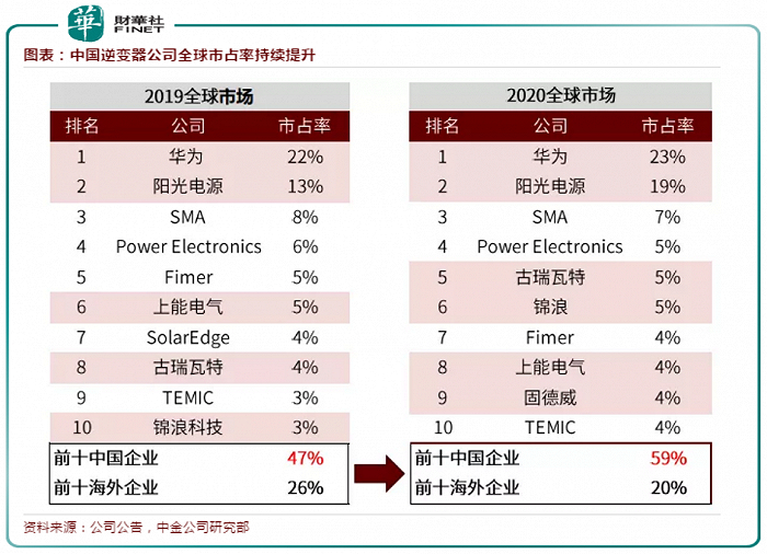 与此同时,锦浪科技、固德威等布局分布式场景以及海外市场的逆变器厂商全球份额也快速提升。据中金研报显示,全球出货量前十名中,中国企业市占率合计约59%,同比提升12个百分点。