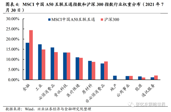 相较于沪深300指数,MSCI 中国A50互联互通指数金融占比更低,先进制造业占比更高。MSCI中国A50金融占比较沪深300低6.2个百分点,工业占比高出2.55个百分点,资讯科技和医疗保健占比相若。