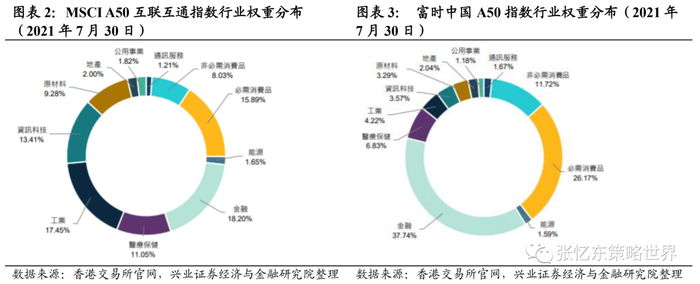 相较富时中国A50指数,行业分布更均衡,避免了过度侧重金融和消费。截至2021年7月末,MSCI中国A50互联互通指数按GICS行业统计,金融占比18.2%,能源加原材料占比仅10.93%,必须消费加非必须消费品占比23.92%,工业占比17.45%,医药占比11.05%,科技加通信服务14.62%。而富时中国A50指数金融占比高达37.74%,消费占比高达38%。