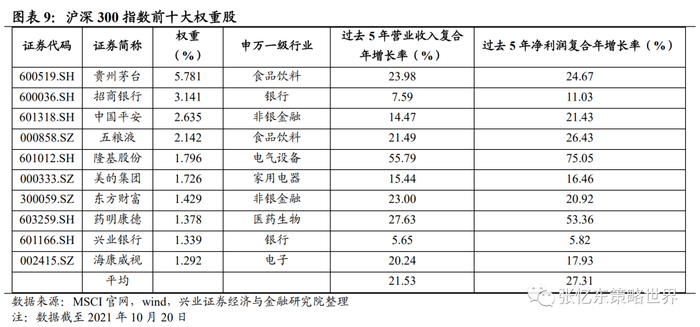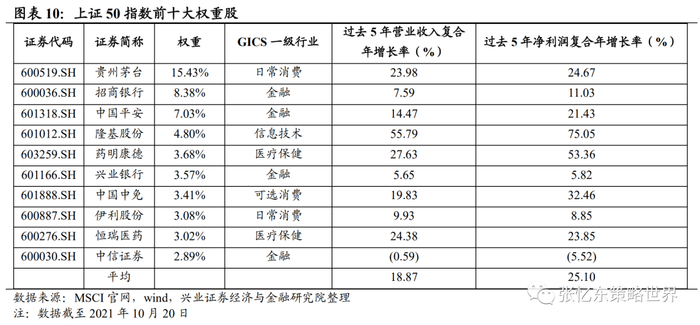 2)该指数前十大权重股过去5年收入复合年均增长率的平均数达到31%,过去5年净利润复合年均增长率的平均数达到36%。而上证50指数前十大权重股中,金融行业就占据了4席,过去5年收入复合年均增长率的平均数19%,过去5年净利润复合年均增长率的平均数达到25%。沪深300指数这两个数据分别为22%、27%。