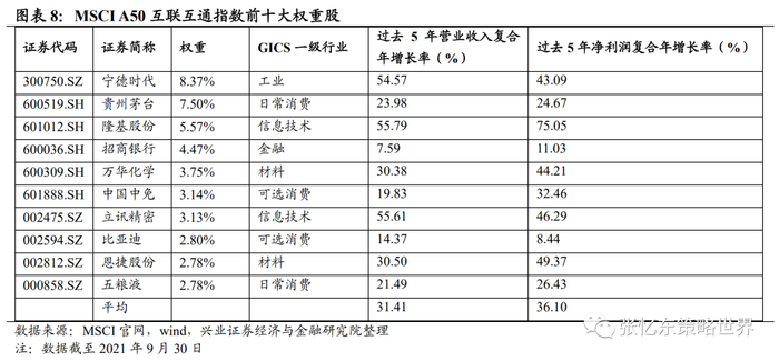 A50指数编制规则使得其能够包含11个大类行业中的龙头,具有较强的竞争力,成长性也非常高。截至2021年9月30日,A50指数前十大权重股中,既有宁德时代、隆基股份、恩捷股份、立讯精密、万化化学、比亚迪等先进制造业的代表性公司,也有贵州茅台、中国中免、五粮液等消费龙头,金融仅一家招商银行。前十大权重股过去5年收入复合年均增长率的平均数达到31%,过去5年净利润复合年均增长率的平均数达到36%。