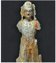 这些出土的造像,其形制主要为高浮雕背屏式造像和单体圆雕造像,而单体造像的艺术特色主要集中在佛、菩萨造像上,特别是单体菩萨像,给人们留下了深刻的印象。尤其是一件东魏贴金彩绘菩萨像,通高200厘米,石灰石质。菩萨头戴宝冠,黑发顺肩部下垂。面相丰满圆润,柳眉高鼻,杏眼长目,嘴唇上翘,呈微笑状,神态庄重宁静。遗憾的是该菩萨的两臂已失,它周身散发出东方的含蓄沉静之美,面带耐人寻味的神秘微笑,被专家们誉为“东方维纳斯”。