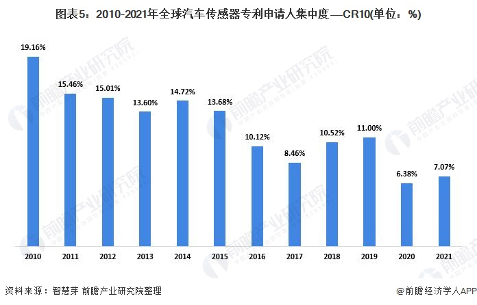 原标题:收藏!2021年全球汽车传感器行业技术竞争格局(附区域申请分布、申请人排名、专利申请集中度等) 来源:前瞻产业研究院