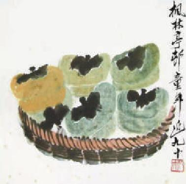 齐白石更好画柿,自喻“柿园先生”,他的《六柿图》《双柿图》《五柿分甘》《柿柿如意》《红柿秋虫图》等作品,设色朴雅,用笔憨态纯厚,带有浓重的乡土气息,自然天真,极富意趣。