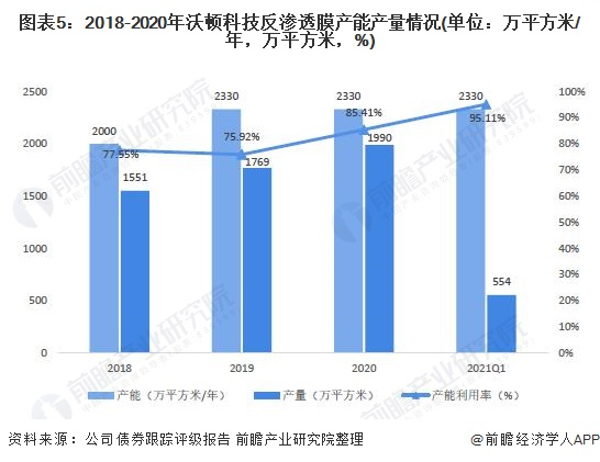 2020年,沃顿科技的反渗透膜产能为2330万平方米/年。2018-2020年,沃顿科技反渗透膜产量由1551万平方米增加至1990万平方米,产能利用率由77.55%增加至85.41%。2021年一季度,沃顿科技的反渗透膜产能利用率达到95.11%。