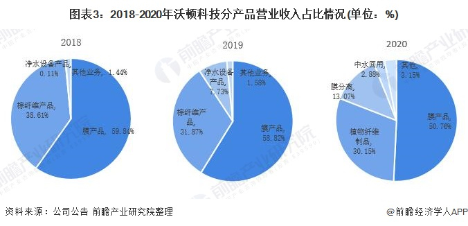 2018-2020年,沃顿科技均以反渗透膜等膜产品业务为核心。2020年,沃顿科技膜产品业务的营业收入占比达到50.76%,植物纤维制品业务的营业收入占比为30.15%;膜分离和中水回用业务营业收入占比分别为13.07%和2.88%。