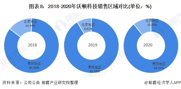 2018-2020年,从沃顿科技销售区域来看,贵阳地区的营业收入占比最高,在90%左右,同时,沃顿科技在北京地区也有所布局。沃顿科技的销售采取“直销+经销”的销售模式,有较为完善的经销商管理体系,双方根据签署的《产品分销协议》开展合作,对部分大客户采用直销模式销售,通过向客户、合作方配套技术解决方案深耕市场、推进应用领域拓展。