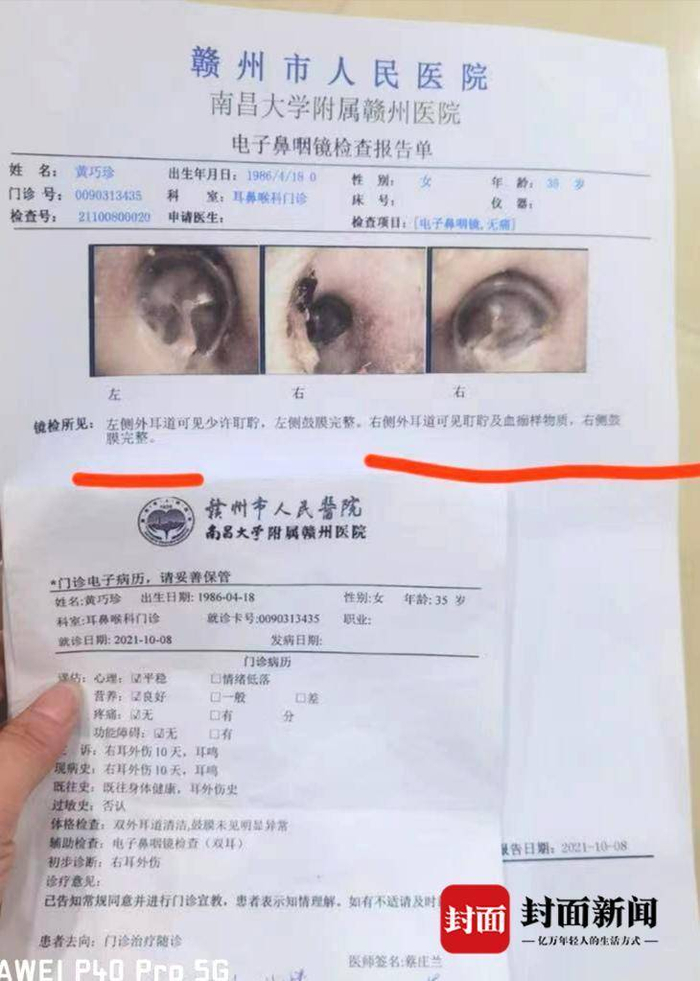 “我是一人去的开学典礼,章贡公安给我的罪名却是聚众扰乱治安,把我拘留了十日。”国庆大假后上班第一天,从看守所出来后,黄巧珍立即到章贡分局投诉派出所民警在看守所门口扇自己耳光。黄巧珍去医院检查,外伤已好,但耳鸣严重。